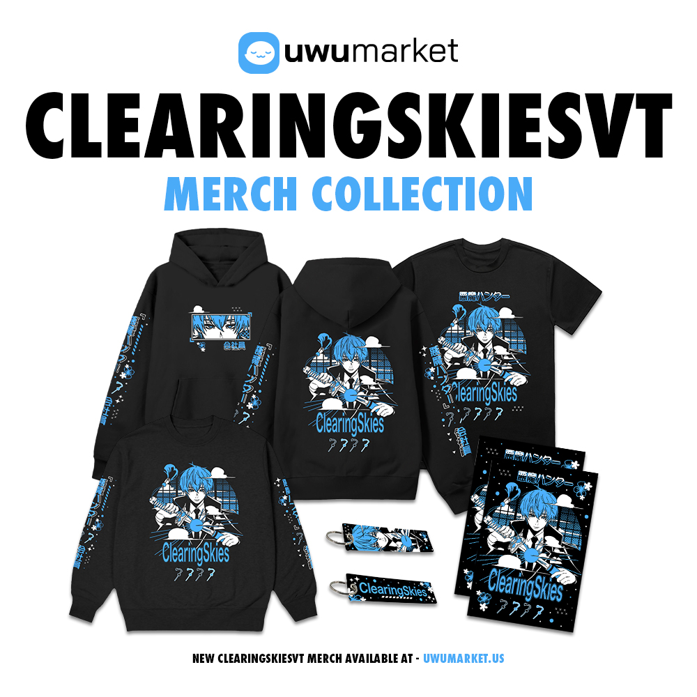 Vtuber street wear never looked so good. Get dripped out in the Clearing Skies x uwumarket clothing and support an indie vtuber!